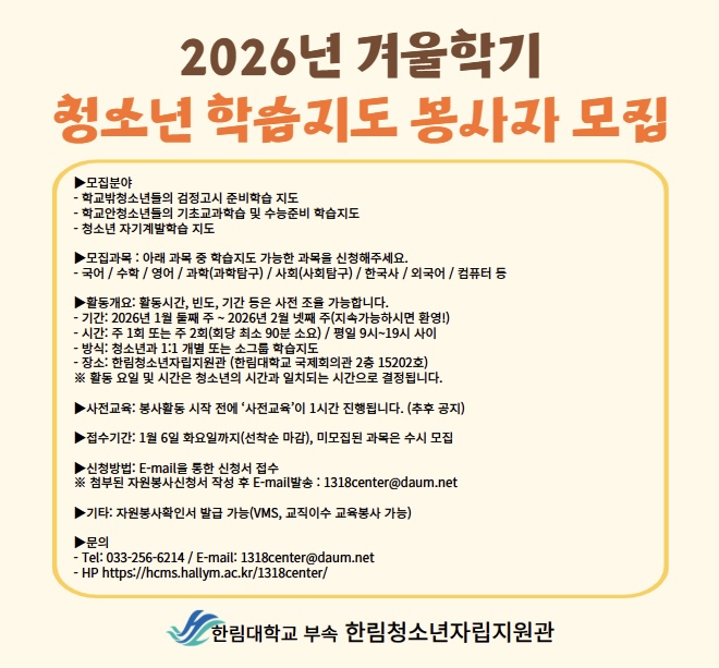 2026년 겨울학기 동안 청소년들의 학습을 도와줄 멘토봉사자를 모집합니다.