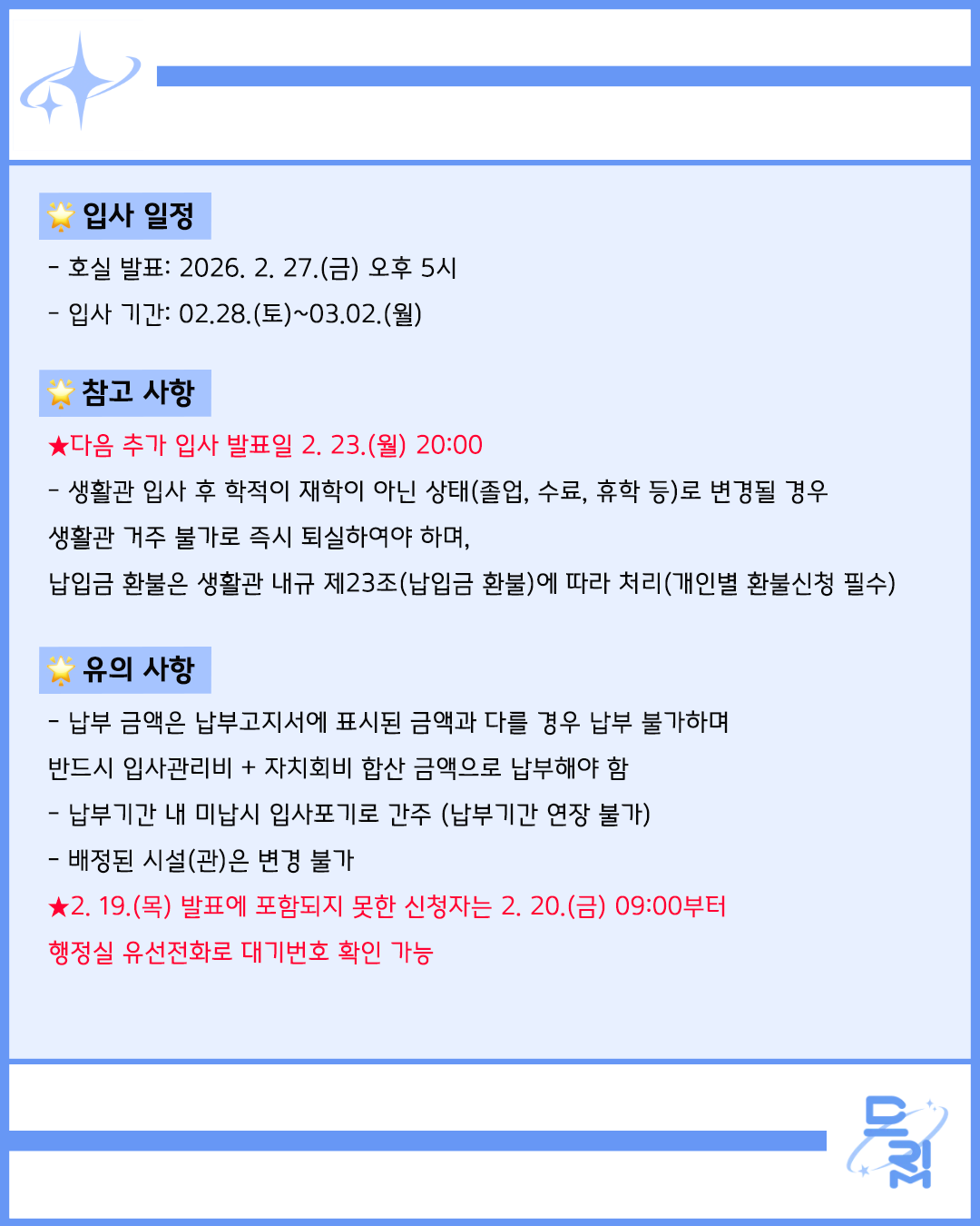 [드림💫]2026-1학기 학생생활관 입사자발표 및 납부안내(2/19)
