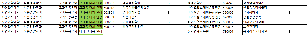 - 타과 교과목 인정 : 타 학과/전공의 해당 교과목을 이수할때, 대응하는 식품영양학과의 해당 교과목을 이수한 것으로 인정
