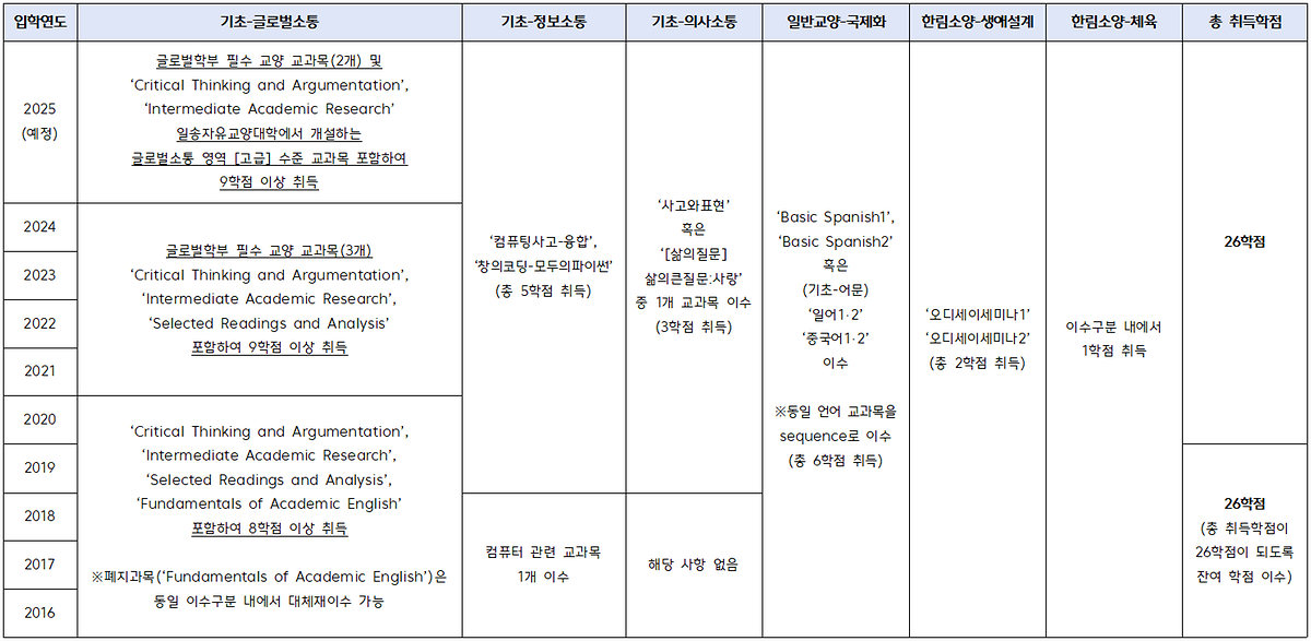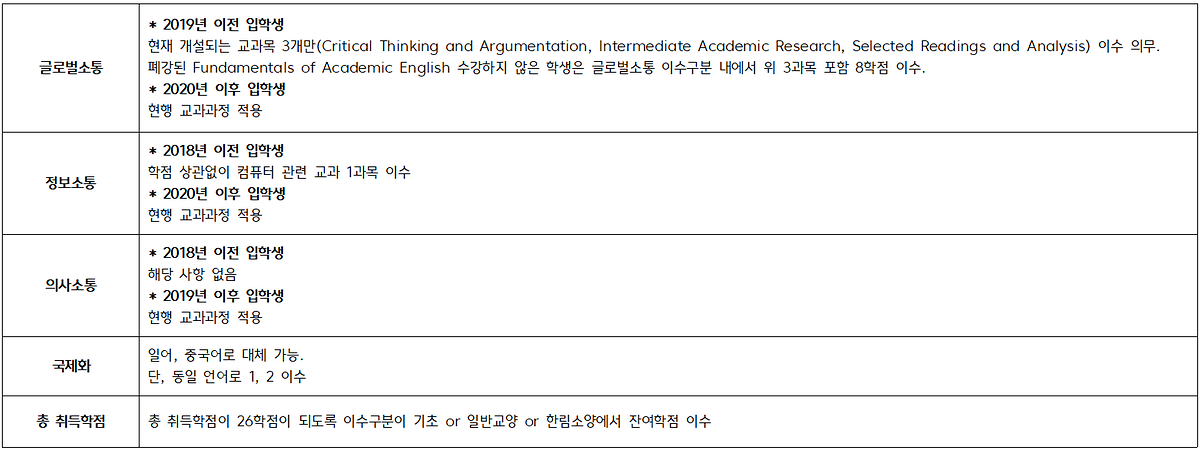 이수구분 전후 변경표의 경우 일송자유교양대학 안내 참고