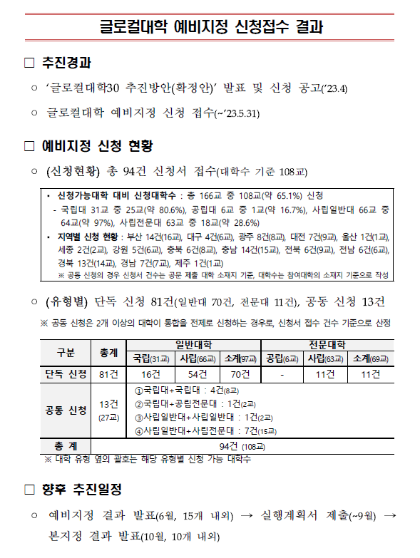 2023. 06. 01. 교육부 글로컬대학 '예비지정' 신청접수 결과(108개교, 총 94건 접수)입니다.