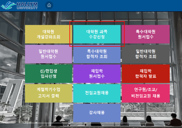 - 대학원 과목 수강신청 메뉴 클릭한 후 로그인(학생정보시스템 아이디, 비밀번호 그대로 사용)