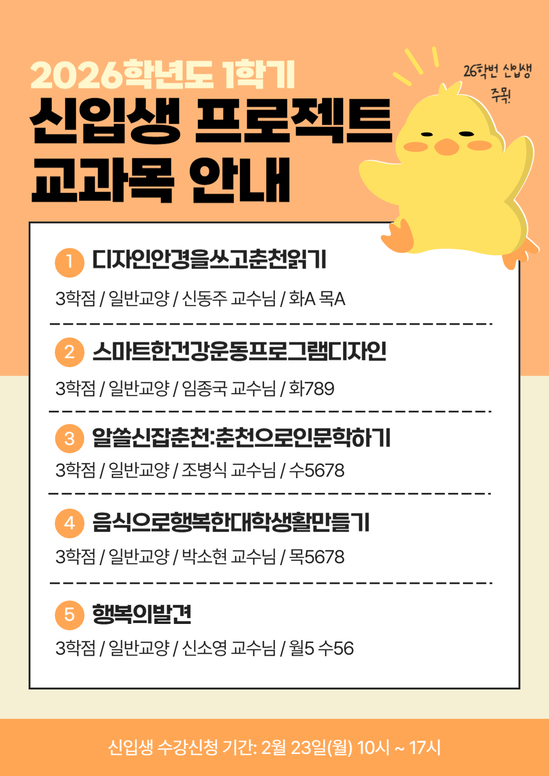 2026학년도 1학기 개설된 신입생 프로젝트 교과목을 안내해 드립니다.