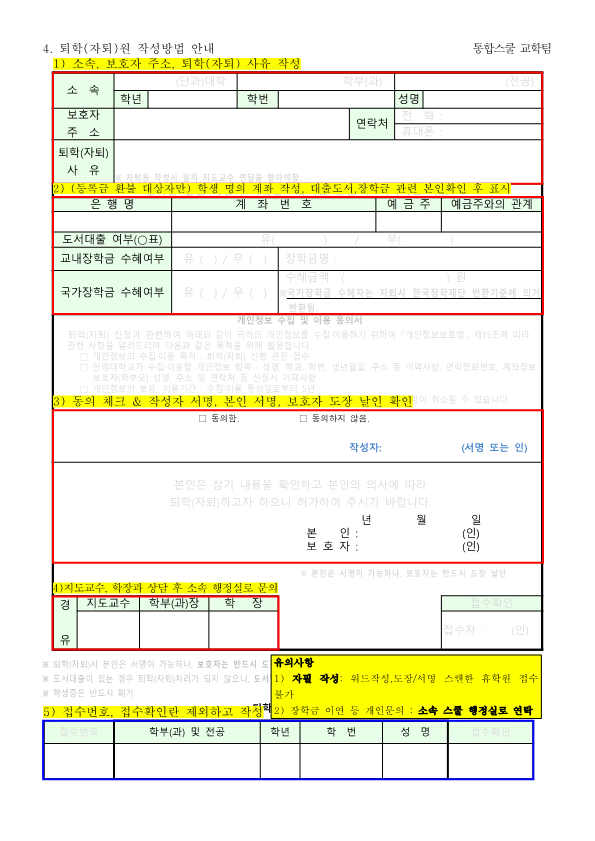 2. 신청서식: 자퇴원 1부(본인서명 + 부모님 도장 날인)