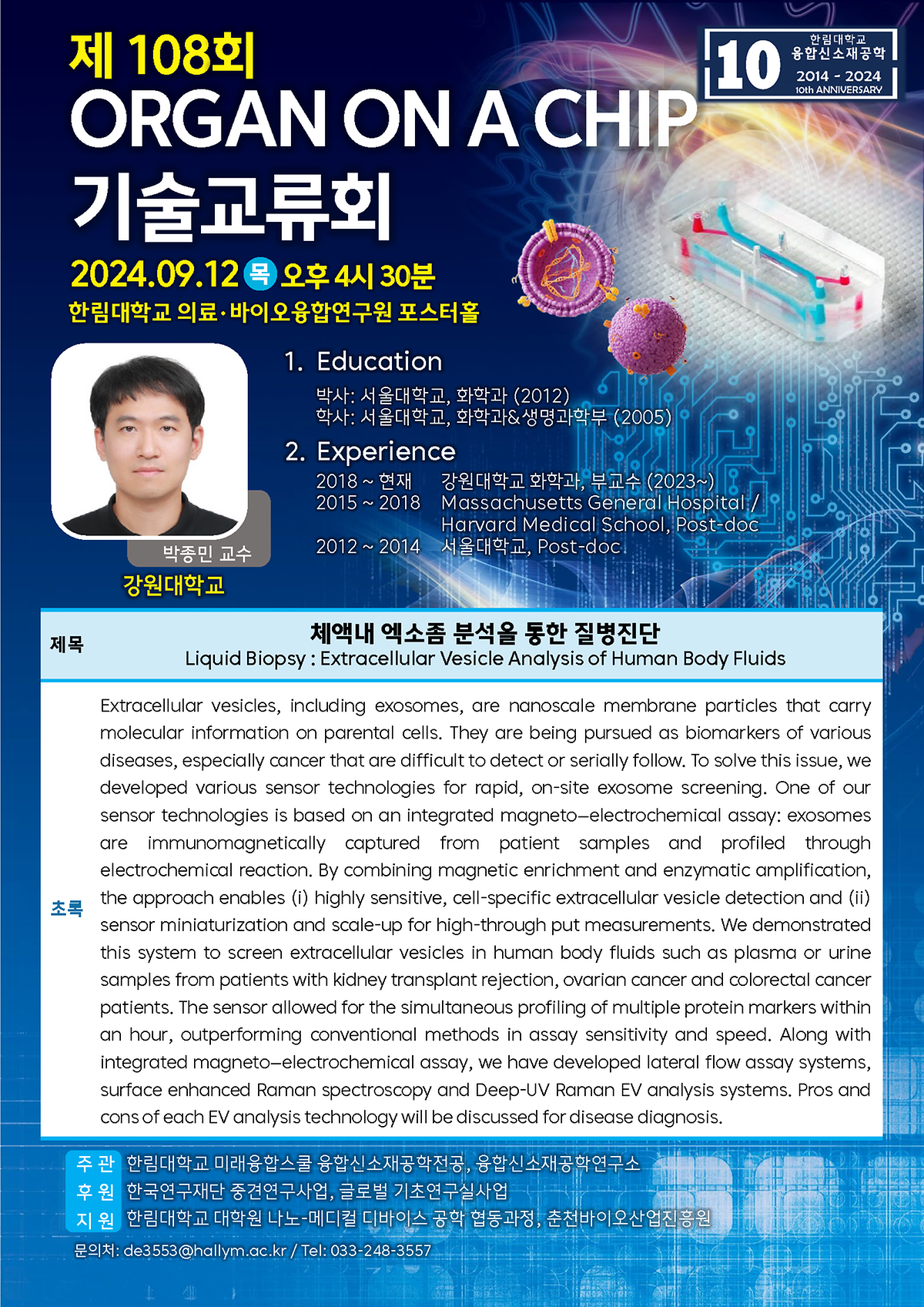 이번 기술교류회에서는 강원대 박종민 교수를 연사로 모시고 '체액내 엑소좀 분석을 통한 질병 진단'을 주제로 강연이 진행되었다.