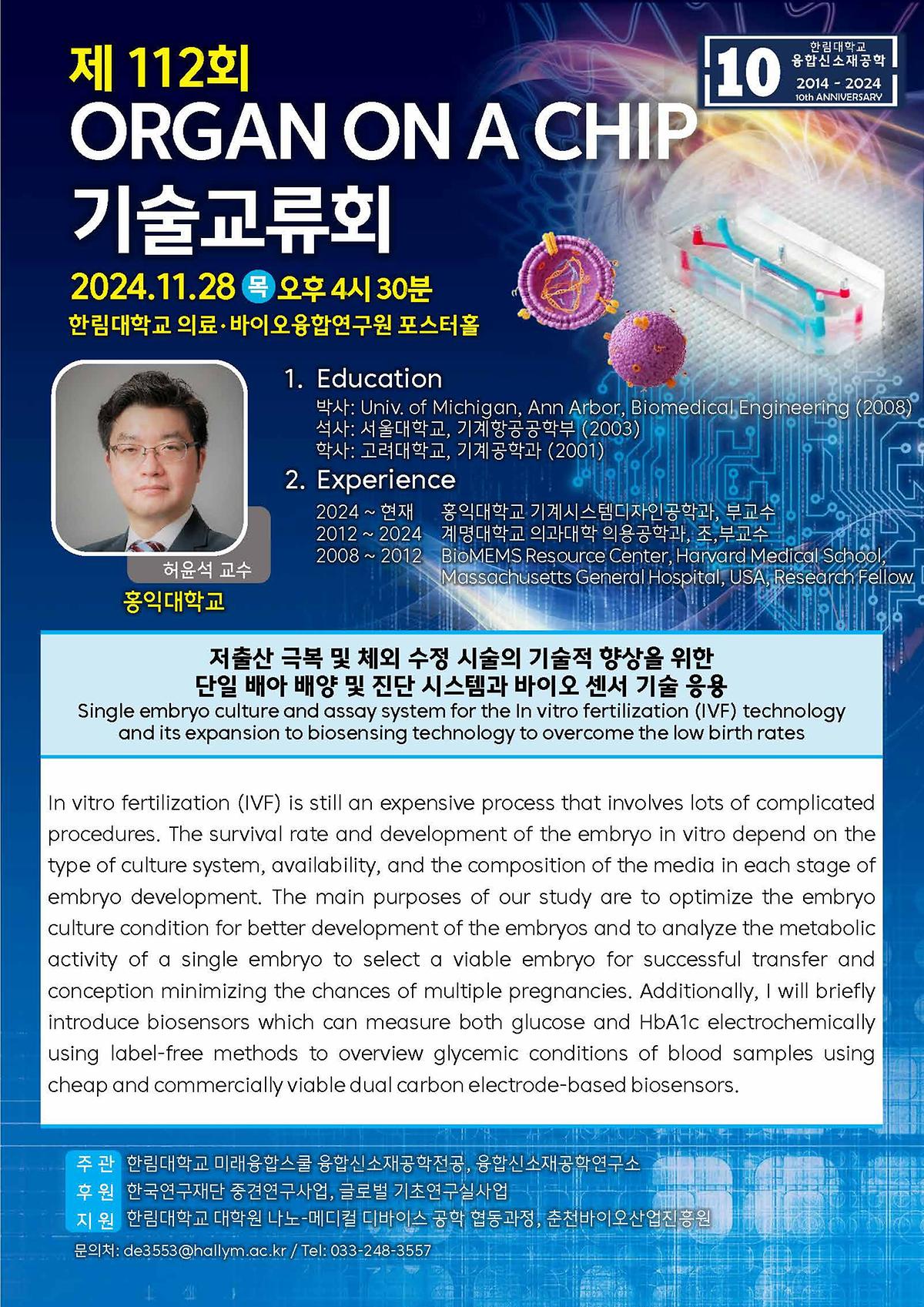 이번 기술교류회에서는 홍익대 허윤석 교수를 연사로 모시고 '저출산 극복 및 체외 수정 시술의 기술적 향상을 위한 단일 배아 배양 및 진단 시스템과 바이오센서 기술 응용'을 주제로 강연이 진행되었다.