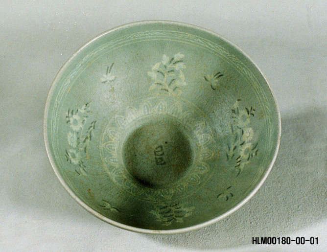청자 상감 '기사'가 새겨진 꽃새무늬 대접