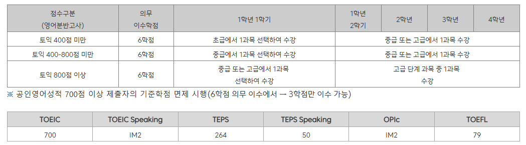 ① ~2022학번 이전 : 영어1,2 또는 대학영어1,2,3,4를 포함하여 영어분반고사 성적에 따라 글로벌소통 영역에서 단계에 맞는 초급, 중급, 고급 표기된 과목으로 2과목 이상(6학점 이상)