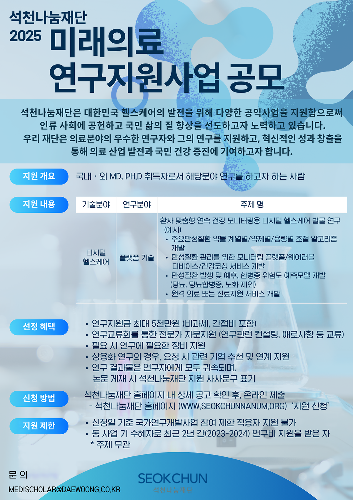 [석천나눔재단] 2025년 미래의료 연구지원 사업 공모 안내