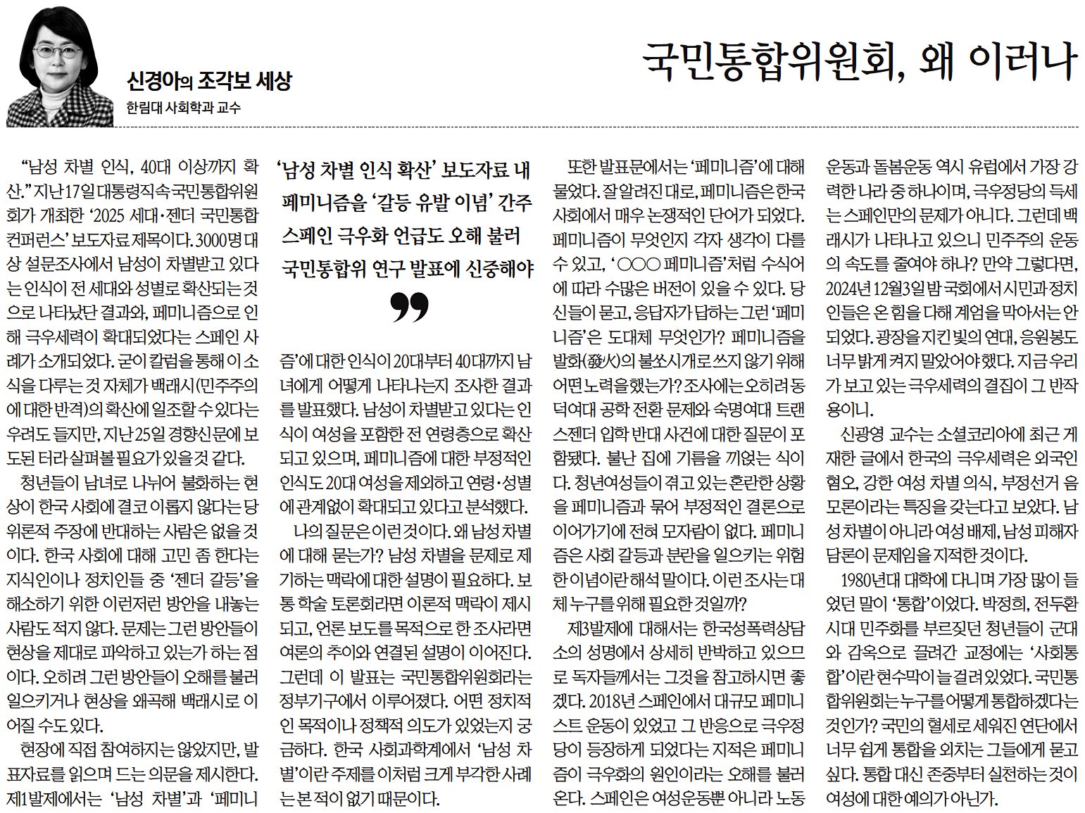 [경향신문] 신경아 교수님 / [신경아의 조각보 세상] 국민통합위원회, 왜 이러나 / 20251229 / 오피니언 25면