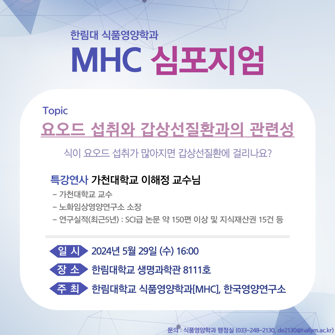 5월 월간세미나는 식품영양학과 MHC와 공동주최로 개최됩니다.
